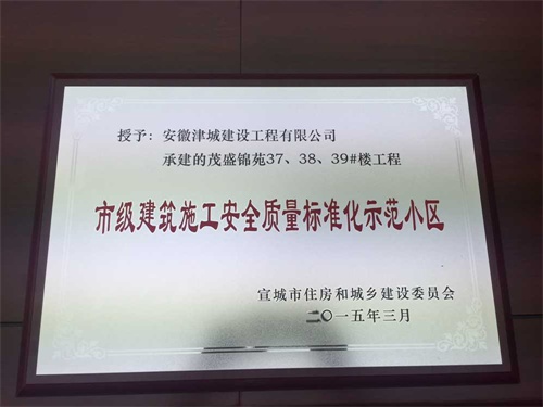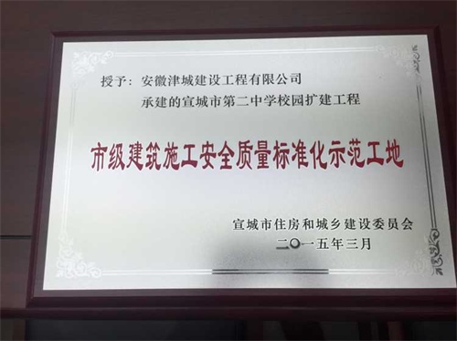 近日,我公司承建的宣城市第二中學校園擴建工程榮獲“市級建筑施工安全質量標準化示范工地”稱號;承建的茂盛錦苑37#、38#、39#樓工程榮獲“市級建筑施工安全質量標準化示范小區”稱號。