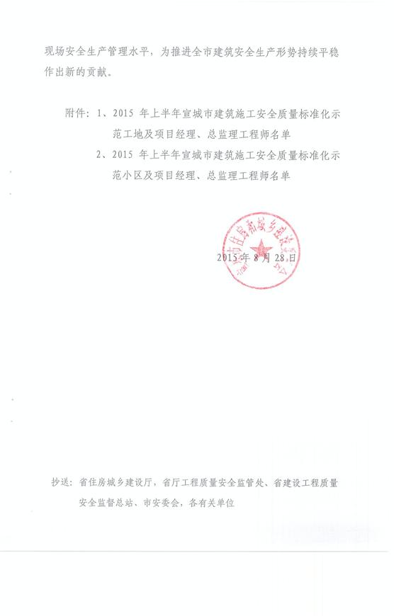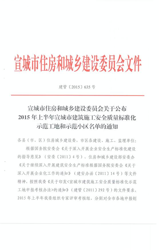 繼宣城市第二中學(xué)擴(kuò)建工程和茂盛景苑3期分別獲得2015年宣城市建筑施工安全質(zhì)量標(biāo)準(zhǔn)化示范工地(小區(qū))后,我公司承建的寧國(guó)市港口園區(qū)安置房西區(qū)1-9#樓工程再次獲得“市級(jí)安全質(zhì)量標(biāo)準(zhǔn)化示范小區(qū)”稱號(hào)。