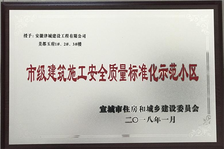 近日、我公司承建的美都玉府二期(西區)工程的1#、2#、3#樓被宣城市住建委評為“市級建筑施工安全質量標準化示范小區”,同時,該工程的項目經理黃磊同志被授予市級建筑施工安全質量標準化示范小區“優秀項目經理”榮譽稱號。